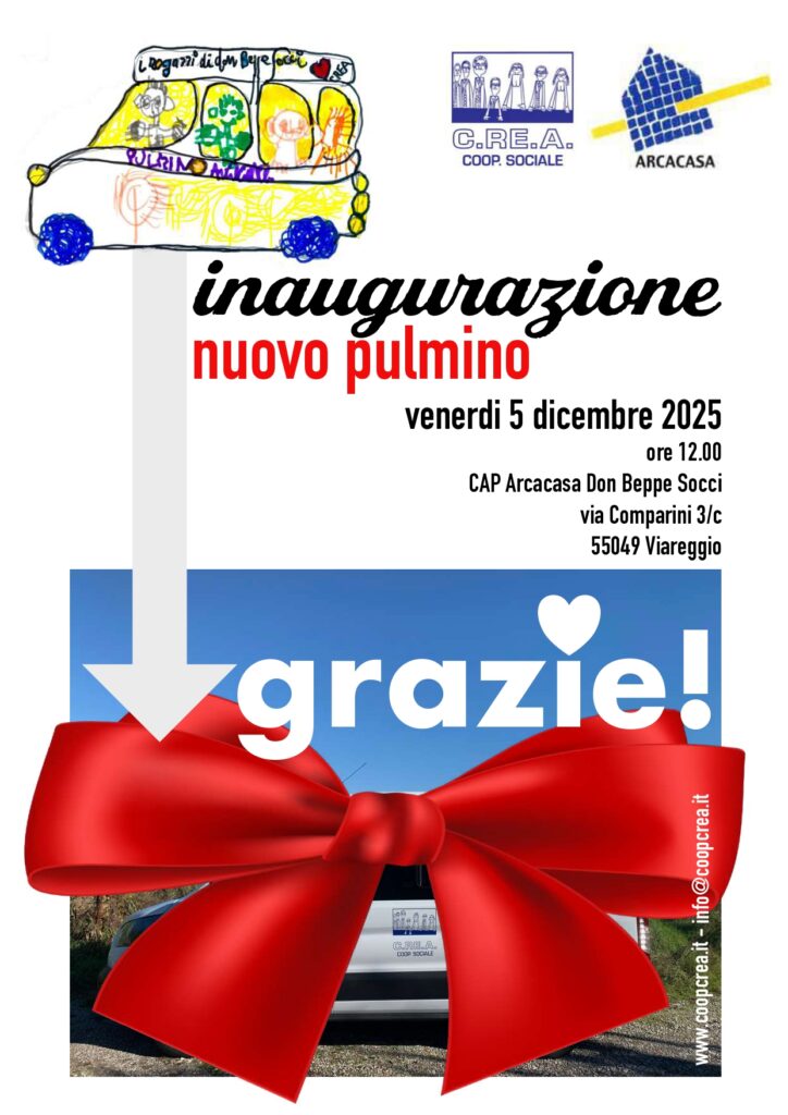 Venerdì 05 dicembre alle 12.00 inauguriamo simbolicamente e con tanto entusiasmo l’arrivo del nuovo pulmino attrezzato dedicato alle persone ospiti alla CAP Arca Casa Don Beppe Socci di Viareggio.