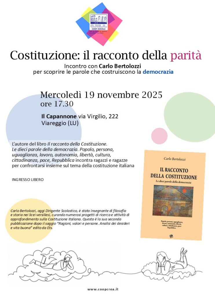 Cooperativa Sociale C.RE.A organizza un incontro con Carlo Bertolozzi partendo dal suo ultimo libro Il racconto della Costituzione. Le dieci parole della democrazia, un’occasione di confronto e dialogo con ragazzi e ragazze per parlare insieme sul tema della Costituzione italiana. L’appuntamento è per mercoledì 19 novembre 2025 alle ore 17.30 presso Il Capannone di via Virgilio a Viareggio.